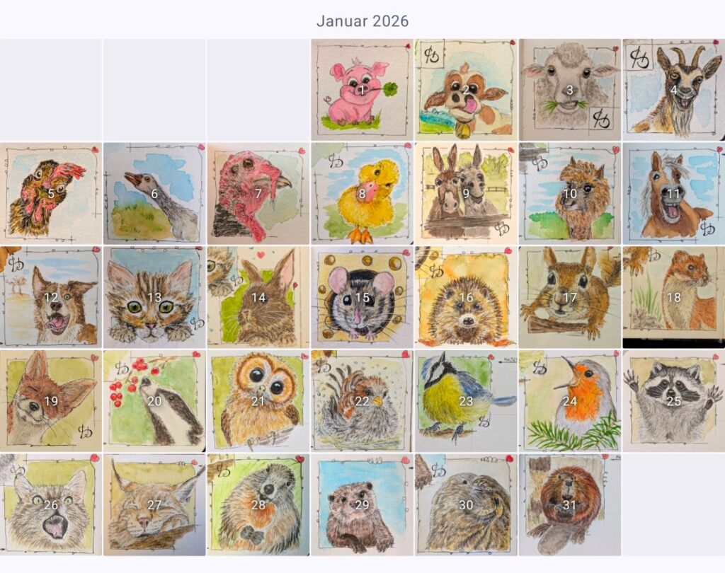 Also habe ich mir ein Skizzenbuch geschnappt und losgelegt. Ich habe mit Tieren angefangen und bin dabei hängen geblieben, da mir die Tierbilder so viel Spaß machen und ich jedes Mal selber erstaunt bin, was mit Stift und Pinsel auf dem Papier entsteht. Und ich male sie so lange, bis ich entweder keine Lust mehr habe oder das Quartalsbuch voll ist. Platz ist genug.